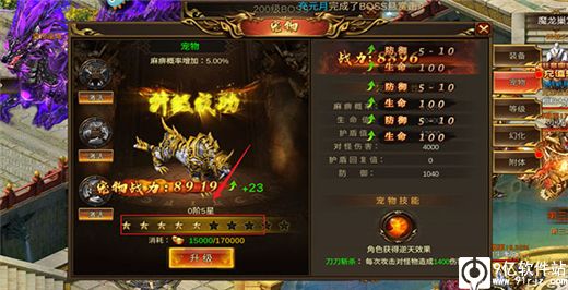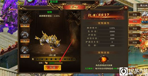 4、进入宠物界面,找到【升级】按钮,并点击它,如下图所示。