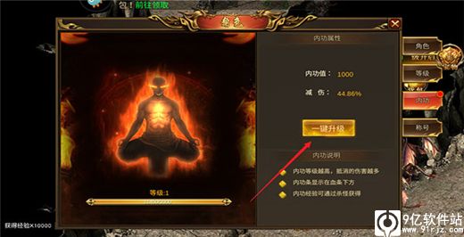 第五步,进入内功界面后,点击一键升级按钮,如下图所示。