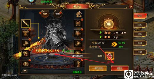 4、进入强化界面后,选择装备,然后点击强化按钮,装备强化成功。
