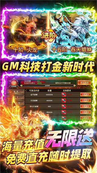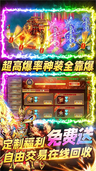 1.上线送:VIP20、10000真充卡、一亿绑金、千万元宝、专属定制称号,真福利!2.GM工具:挂机打BOSS无限掉落GM卡,直接代替RMB充值,免费畅玩!