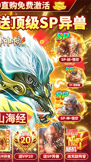 1、上线送VIP20、元宝*1888888、超级礼包、无限资源、上线就起飞!2、首日在线立送1000元蛮荒卡,高级百连抽!