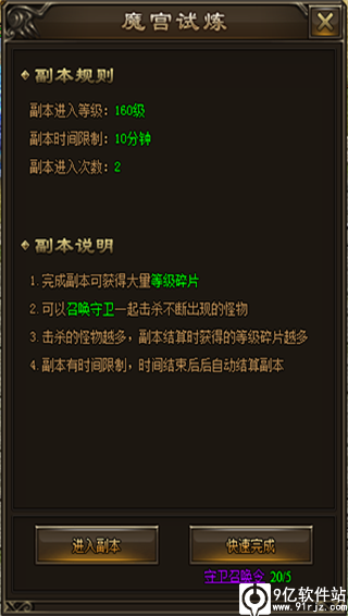 大家满足副本等级要求,即可前往中州城安全区范围,找到NPC“上将军李苏畏”对话,即可进入魔宫试炼副本。玩家进入这个副本后,可以获得系统赠送的5个守卫令牌,大家可以使用这些令牌,在副本内召唤出守卫,来帮忙消灭副本刷新出来的怪物。每次副本最多可以召唤10个守卫。玩家可以花费钻石,来购买守卫令牌,每天最多可以购买20个守卫令牌。
