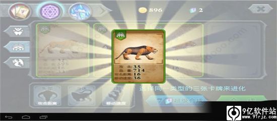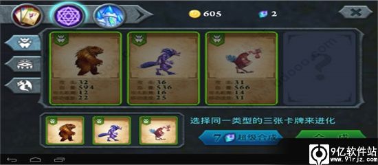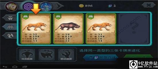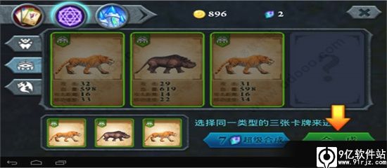 接着点击上面多面体紫球,进行合成,左边三个选项卡是三个属性分类,第一个是直立行走的动物,第二个是爬行动物,第三个是飞行动物,因为每次合成至少要三个动物,并且这三个动物必须属于同一种类型,所以我们先来合成老虎犀牛老虎。