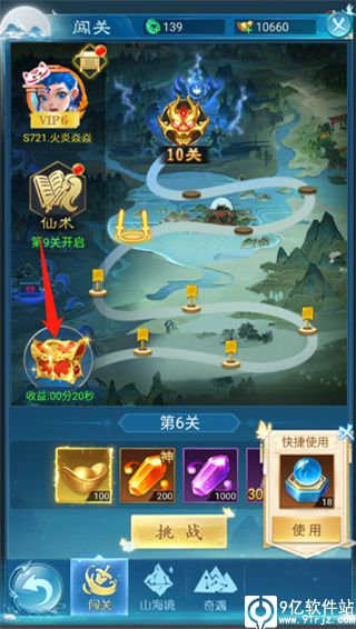 玩家登录到游戏主界面,点击在主界面左边的闯关按钮,点击宝箱打开收益界面,玩家每下线一段时间再次返回游戏后就可以领取挂机收益,最多可以储存一天(24小时)的经验收益。