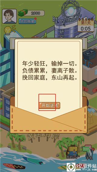1、进入游戏首页,我们可以看到角色的基本信息,负债累累加妻离子散,我们点击开始逆袭,帮助主角逆袭;