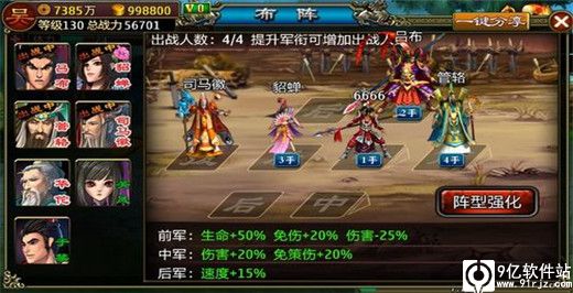 激活后可在“布阵界面”选择一名武将作为替补。战斗中当我军有伤亡时,替补武将会立即替补上场。战斗替补系统使得游戏更富有战略性,可针对不同对手配置不同的武将,选择不同的技能。只有充分了解各种武将组合的优劣,并准备好各种类型的替补武将,才能真正玩转替补系统