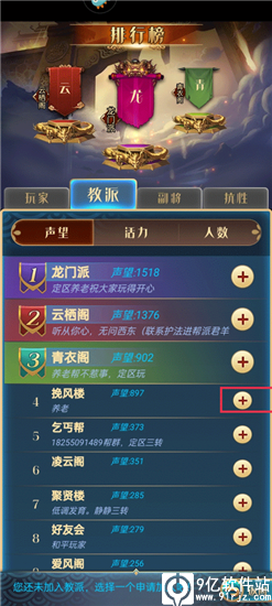 2、教派从声望、活力、人数这三种来进行排行,你可以选择其中声望值比较合适的教派,然后点击右边的“+”加入进去