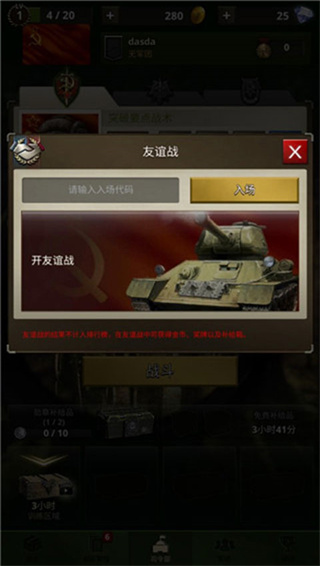 2、在这里可以输入好友分享给你的入场码,点击入场就可以了,也可以点击【开友谊战】来自己建立房间。