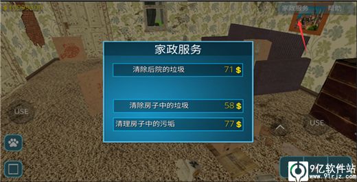 2、成功进入房间,点击右下角的这个图标可以使用道具来打扫垃圾;