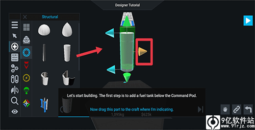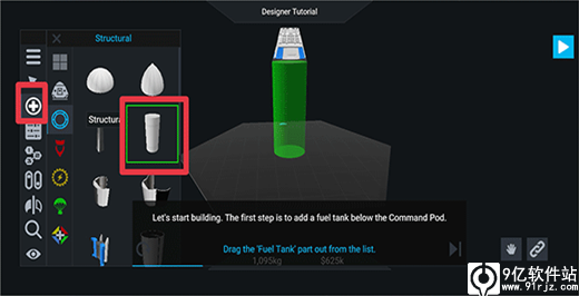 3、进入后根据提示在指挥舱下方添加一个燃料箱。点击带加号的按钮并选择structural