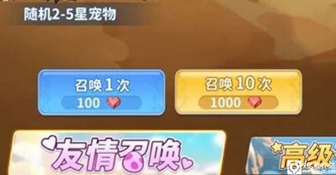 1)友情召唤:消耗100友情值可以召唤1次(友情值可以通过好友互动、冒险活动来获取),随机出2-5星的精灵。