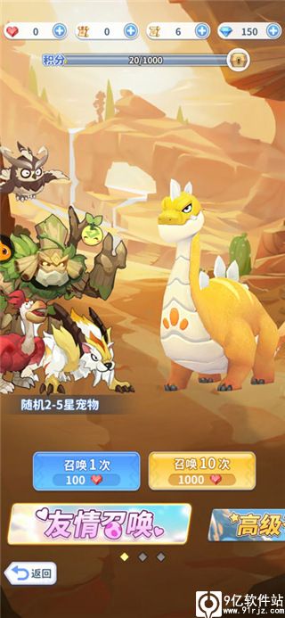 (2)友情召唤:消耗100友情值可召唤一次宠物(随机2-5星),友情可在好友互动、冒险活动中获取。