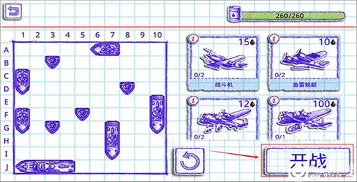 6、最后一步就是二号玩家的备战阶段了,这里和一号玩家一样,就不赘述了,购买完成后点击右下角的【开战】按钮。