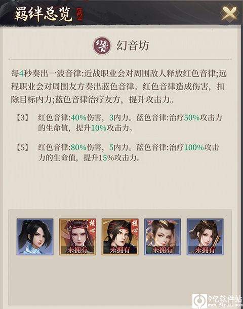 以音律的形式展现,每名角色根据攻击距离的不同会释放出红蓝两种音律:红色音律伤人削蓝,蓝色音律回血加攻。所以如果想要最大化发挥出幻音坊的輯华效果,就需要将远程侠客和近战侠客两两分组进行布置,这样可以让近战也能享受到蓝色音律的回血效果同时为远程侠客创造更好的输出环境。