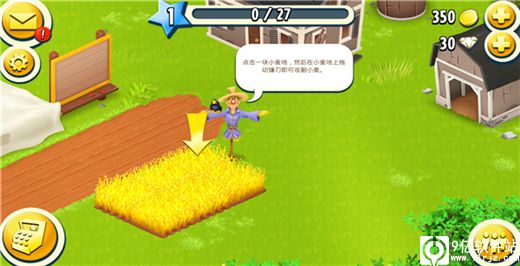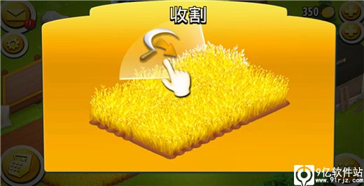 4、按照教程提示,点击小麦,选择镰刀,然后拖动镰刀收割整片小麦;