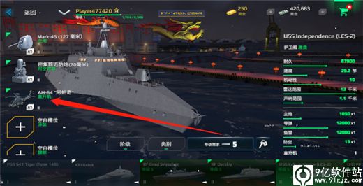 3、部分战舰购买不但需要花费货币,且有着等级要求,但可以开启更多等多的武器与玩法,如下图所示战舰,玩家购买后就可以尝试驾驶ah64阿帕奇战斗机进行战斗。