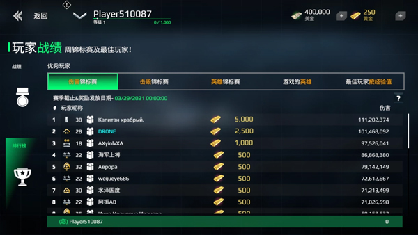 3、而在获得的英雄称号之后,在所有的英雄玩家之中又会有一个排行榜。如果还能在这一个排行榜中获得比较靠前的伤害值,或者击沉战舰数量,就可以同时获得了传奇称号。