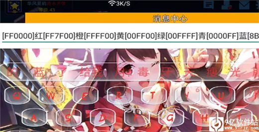 4、这里只要在字面前加入相对应的颜色代码,就可以打出相对应的字体,比如打出一个红色的“红”字,那么就在前面加[FF0000](其余类推),如下图所示: