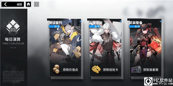 每日演算的开启条件是将主线推进到[2-5]后开启,是获取价值点、经验卡、装备箱三项基础资源的主要途径。而关卡需要逐层解锁,奖励也会逐层增加,每日会有三次免费的挑战机会。不过要注意,首次通关难度等级,是不会消耗挑战机会的,所以记得留意,把次数都用完别浪费。