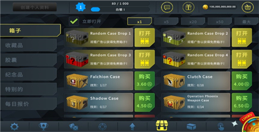 打开不同的盒子收集皮肤。根据玩家当前的CS等级,他一次最多可以打开5个箱子。