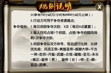 在官府府邸争夺中,优先比拼双方的称号,称号一致则再比拼双方的官品和政绩,所以有称号的大人在官府府邸的争夺中就会更具优势,可以占领更好的据点,获取更多的行动力!