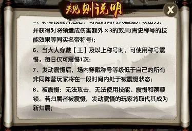 在副本全军出击中,称号的作用则更为强力!大人若持有王以上的称号,则可以额外使用技能,可以在短时间内大幅提高攻击力,并且可以使用称号震慑一次,发动震慑可以将场内所有称号低于自己的非同阵营玩家处于无法攻击的震慑状态,处于震慑状态的玩家若是归属,则发动震慑的玩家取代成为新的归属。