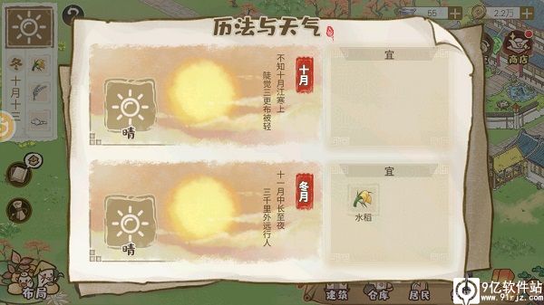 4、在解忧小村落手游最新版中还有很多不同的天气,比如雨天、晴天、暴雨、冰雹、下雪、大旱、洪涝等等,不同天气会直接影响农作物的产量,因此玩家们在里面遇到恶劣天气时,一定要注意保护自己的田园哦,比如修建一些排水渠、搭建一个大棚等等,天气除了会影响农作物的产生外,还会让村民的劳动受到限制,小伙伴们千万不要让村民在恶劣天气下工作哦。