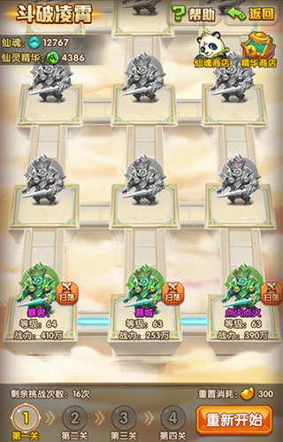 1、斗破凌霄一共有4个大关卡,每次通关后可以开启凌霄宝箱,获得仙灵精华、仙灵进阶石和仙灵经验的奖励哦!