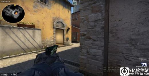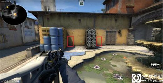 当T进攻B点断后的时候,站这里比贴墙好的原因是因为地图的改动,香蕉道门口两边都可以站人,此时如果对手稍有头脑就会先看右边(图中准星瞄准的地方)再来检查左边,此时你完全可以提前半个身位知道他的动向。