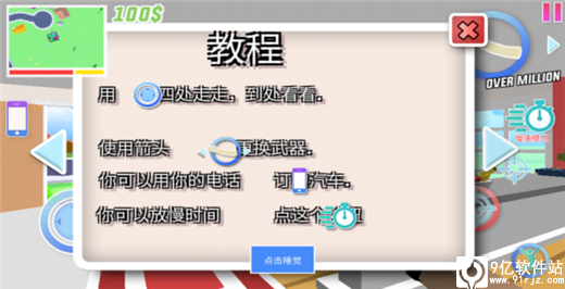4、进入游戏后可以看到教程,滑动摇杆控制移动,使用箭头可以切换武器,点击手机可以订购汽车