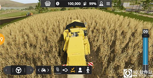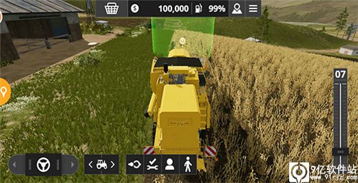 3、这是模拟农场20手机版游戏初期您拥有的田地之一,田里的小麦已经成熟,是时候收割了,使用联合收割机即可收割田里的作物,右侧滑动条是油门,控制前进后退,左侧的方向盘控制左右转弯。
