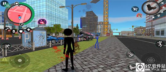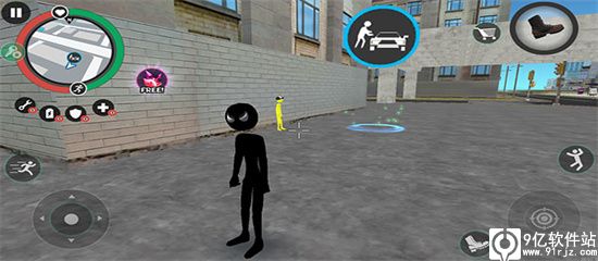 5、点击左侧的摇杆可以控制火柴人进行移动,点击右侧的钩子可以化身蜘蛛侠自由穿梭,点击“人”的图标可以跳跃,点击瞄准镜图标可以进行攻击。