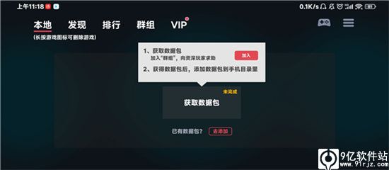 2、点击获取数据包,加入群组后向资深玩家求助,获得数据包后再添加;
