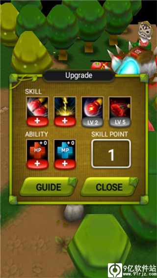 在英雄或己方小兵消灭敌人时,英雄会得到经验值,即屏幕最下方的EXP条。当英雄升级时生命和魔法值都会得到小幅的提升,并且还会获得技能点数,可以点击左下角的红色“+”按钮来分配技能点。如果只看技能图标并不了解具体作用的话,还可以点击“guide”来查看技能的具体作用。