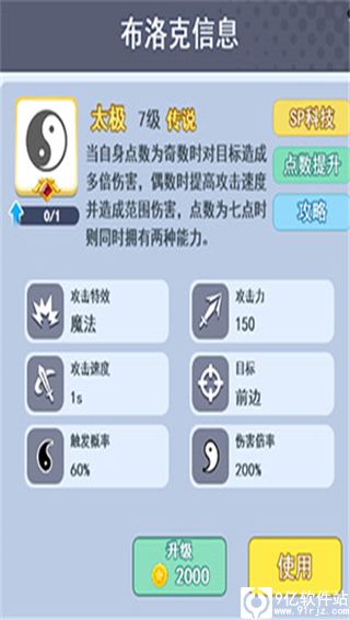 太极布洛克拥有两种攻击状态,单点数时有概率对攻击目标造成多倍伤害,双点数时提升攻击速度并且能造成范围伤害,当太极的点数为七时,他可以同时拥有这两种攻击状态。