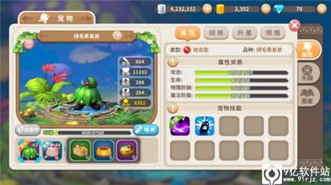 游戏中在宠物界面的属性面板中,可以看得到宠物目前的等级以及一个基础的属性值的情况,而玩家可以通过点击宠物栏上的喂食按钮对宠物进行喂食,也就是升级。