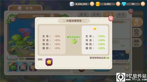 5、而升星玩法就更加简单直观了,玩家可以通过消耗宠物升星所需要消耗的道具来让宠物升星,可以看到,升星带来的直接是全属性增加10%的超强提升,由于升1星就需要18个消耗品,皮皮骚这个刚回归的人来说根本没有,所以也没法为各位勇士们带来第一手的升星属性加成图,不过之后有机会皮皮骚会补上的。