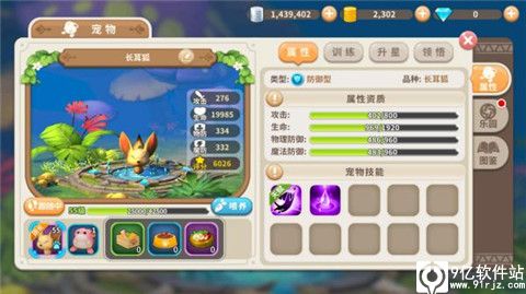 2、勇士们在宠物界面的属性面板中可以看到自己宠物目前为止的一个等级,属性,资质以及技能的情况,那么我们属性面板作为一个汇总的情况简报我们就不多说了,直接进入核心内容。