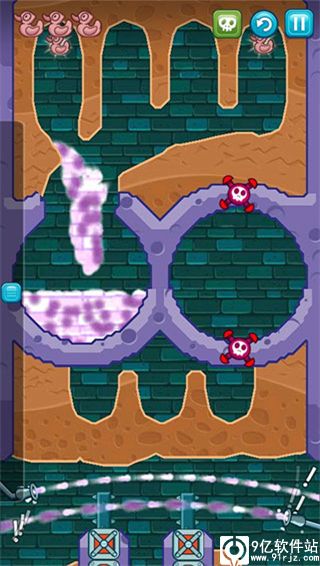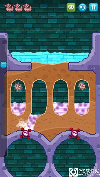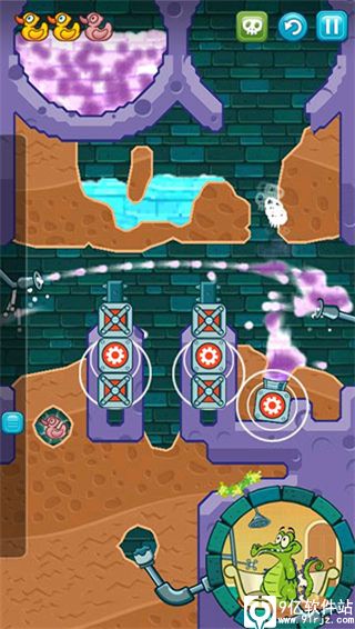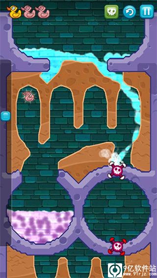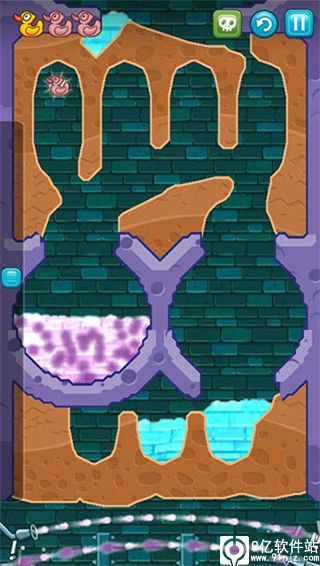 8、挖出如图一样的路来,将清水引下,收集到最后一只鸭子,最后将水引入小顽皮的浴室即可过关。