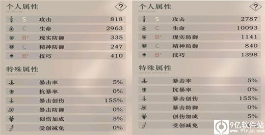 先来比一下个人属性:左侧是狼群1级的面板,右侧是狼群洞悉一30级的面板。