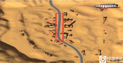 地图选用的是一张沙漠地图,比较符合现代战争的风格,地图两边是高坡,给步战车以及八轮突击炮提供了不错的侦查以及黑枪的位置,用方块圈出的位置如果可以抢下来,那么不管是视野还是火力压制都有着明显的优势,圆圈都是一些黑枪的点位