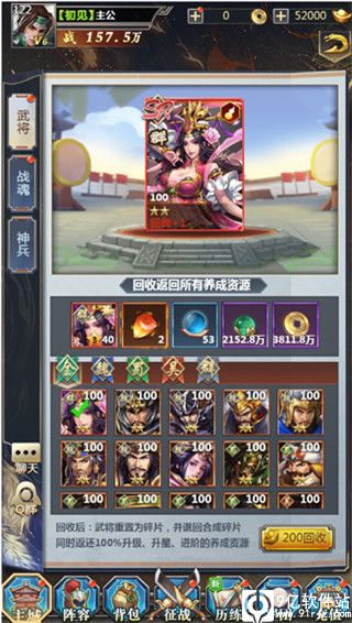 5、武将回收可分解武将,返还所有养成资源及武将碎片。