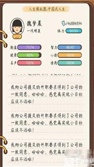 毕业开始求职了,应聘你想要的职业,从最低岗位开始(每年2次加班,3年后就能升职加薪了)后续升职与你的属性有关。关于成年后的名声和情商,我这里简单说下,名声做慈善来得快,钱少可以1万1万的捐。情商得看几率,健身、事件都有几率加情商。颜值、智力、健康和心情可以在健身里刷(推荐普拉提和维密)。