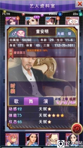 1、 训练艺人当我们拿到一张新卡牌,一般来说第一件事就是先训练他。以新卡牌童安明为例,他是一张舞蹈职业的S卡,如图是他的初始属性,没有经过训练的情况下,数值比较差,在这种情况下,不能马上让他上阵比拼,一定要通过训练。