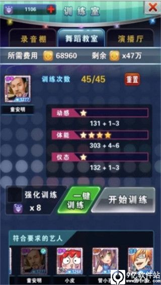 训练地点在训练室,将训练对象切换成他,在金币允许的情况下,将他的训练次数加满,没必要消耗钻石进行强化训练,一次性加满就要选择【一键训练】,需要消耗87万金币。经过训练后,他舞蹈属性值增加了几倍,参数见下图。所以,对于艺人来说,训练是他们最基础,也是前期最快的提升实力方式。但是每个等级的艺人都有自己的训练上限,玩家可以通过陪练的方式增加主力艺人的训练次数,直到达成训练极限为止。