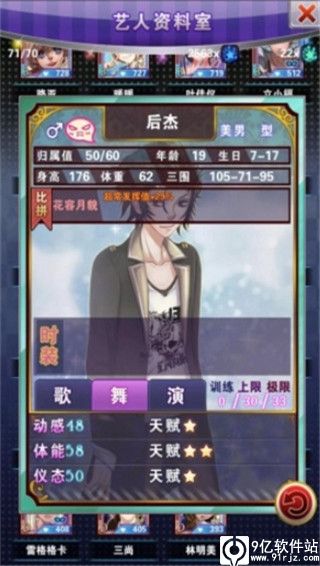 每个艺人都会受到自身等级的限制,造成技能发挥的力量,以及训练次数受阻。只有将艺人成长,才能提高他们的这两项数值。但是艺人成长并不是那么容易,低级艺人升级很容易,但A级以上艺人升级受到的限制就很多,包括金币、艺能精华以及成功概率。为了清晰展现升级的威力,我们照样举个例子,以C级舞者后杰为例,观察他成长前后的技能和属性值。成长前,他的比拼技能是“超常发挥值+29%”,训练极限是33。接下来我们将他放到改造槽进行成长突破,当成长到A级后,可以看到他的“超常发挥值+43%”而且训练极限也变成了47次。这样一来,他的属性值会比C级时提升很多。