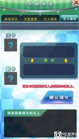 当我们有几张同名的卡牌时,就可以用来强化了,但是强化和被强化的这些卡牌必须都在SS级以上。当艺人强化后,副卡就被吃掉了,这时主卡的基础属性值就会惊人地几百几百地翻倍,对于后期玩家来说,比拼的就是谁的卡牌强化得厉害。