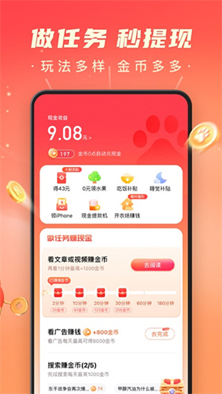该app可以通过做任务赚取金币来换钱。下面教大家如何进行操作以及进行提现。