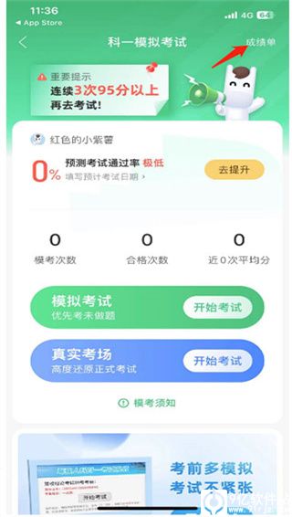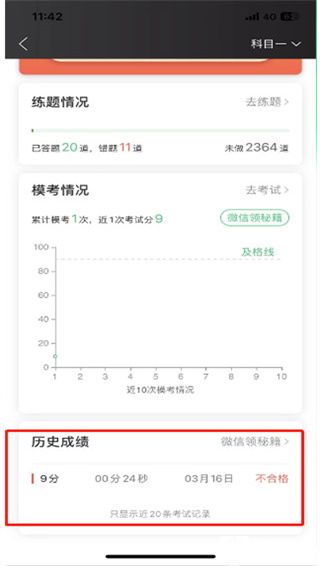 3、这里可以显示你的模考次数、合格次数以及近几次的平均分等。