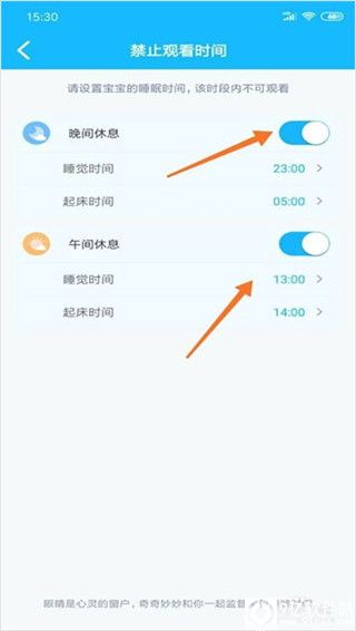 4、进入禁止观看时间界面后,可以设置晚间休息时间和午间休息时间,勾选之后,选择时间段。